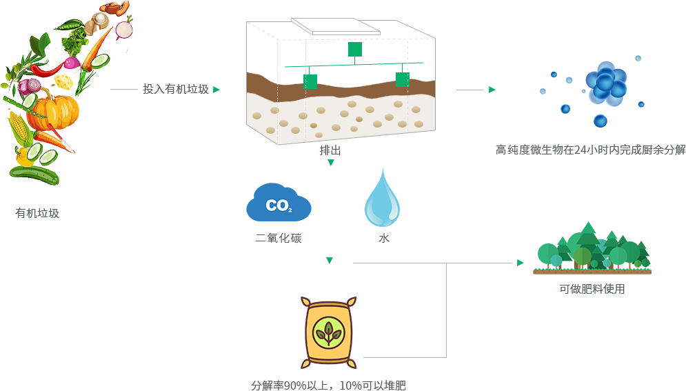 通過將有機(jī)垃圾進(jìn)行快速分解,產(chǎn)生對(duì)人體無毒無害的水蒸汽和二氧化碳 ,最終達(dá)到提高人們生活品質(zhì)和改善生態(tài)環(huán)境的目的